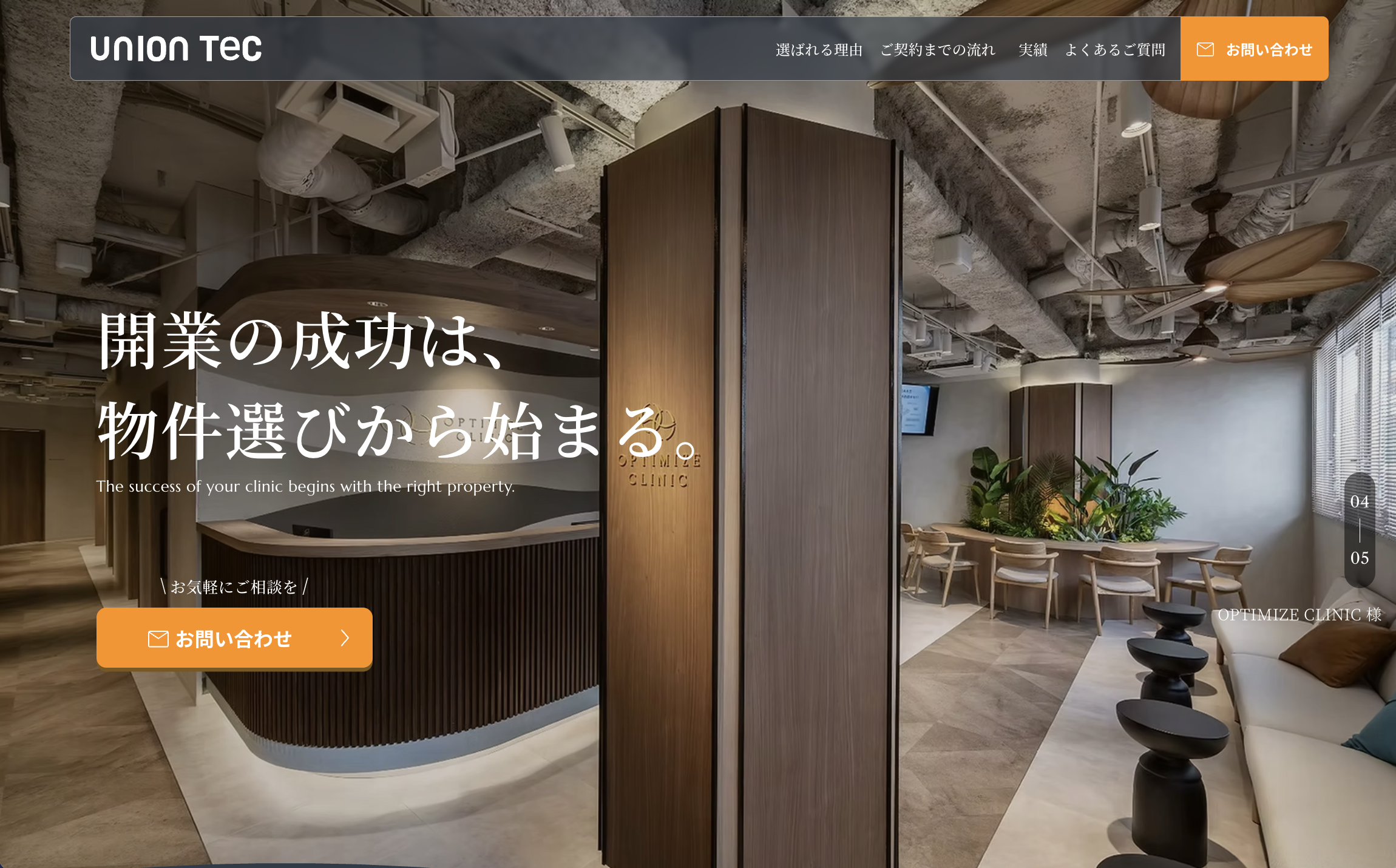 美容医療クリニックをはじめとしたクリニックデザインや、オフィスデザイン・設計施工をワンストップで行うユニオンテック株式会社(本社:東京都渋谷区、代表取締役:大川祐介 以下、ユニオンテック)は、新規開業・移転・分院展開を検討するドクターに向けて、「クリニック物件探し支援サービス」を開始しました。