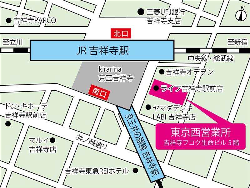「東京西営業所」は、JR中央・総武線「吉祥寺」駅から徒歩3分、京王井の頭線「吉祥寺」駅から徒歩1分、エリア最大級の大型LEDビジョンを擁する吉祥寺の新たなランドマーク「吉祥寺フコク生命ビル」に入居いたします。