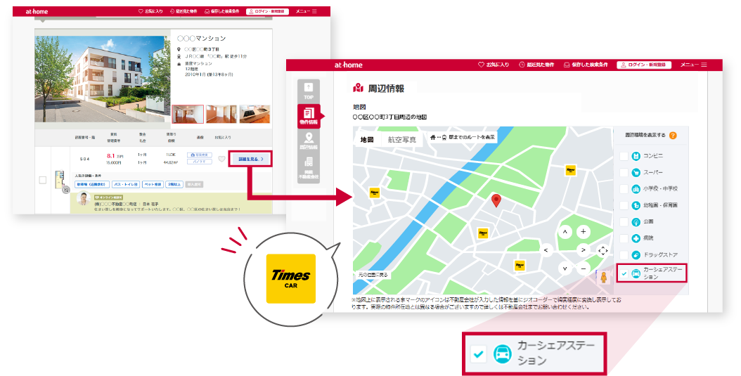 タイムズモビリティ株式会社(本社:東京都品川区 代表取締役社長:川上 紀文 以下、タイムズモビリティ)と不動産情報サービスのアットホーム株式会社(本社:東京都大田区 代表取締役社長:鶴森 康史 以下、アットホーム)は、カーシェアリングステーション情報の連携を開始したことをお知らせいたします。本連携では、アットホームが運営する「不動産情報サイト アットホーム」の物件詳細ページにおいて、地図上にタイムズモビリティが全国に展開するカーシェアリングサービス「タイムズカー」のステーションを表示します。これによりタイムズカー会員様の住まい探しにおける利便性向上に寄与します。
