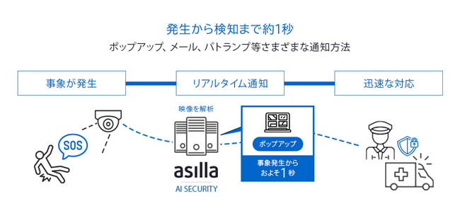 アジラは、独自開発の「行動認識AI」を基盤とし、映像上の人物の姿勢や動作をリアルタイムで解析することで、転倒・暴力・侵入・放置物などの異常行動を即時検知・通知するAI警備システム「AI Security asilla」を提供しています。この技術は、警備業界が抱える人手不足や高齢化、コスト増といった課題に対する有効な解決策として注目されており、国内外の複合施設・駅・ホテル・病院・空港など150施設以上に導入実績があります。