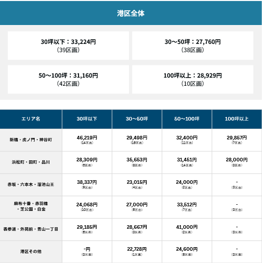 各区ごとに焦点をあてると、エリア間のばらつきも激しいことが分かります。例えば港区の30坪以下で見てみると、一番高額のエリアで4万円台後半となる一方、2万円台半ばで借りれるエリアも残っています。