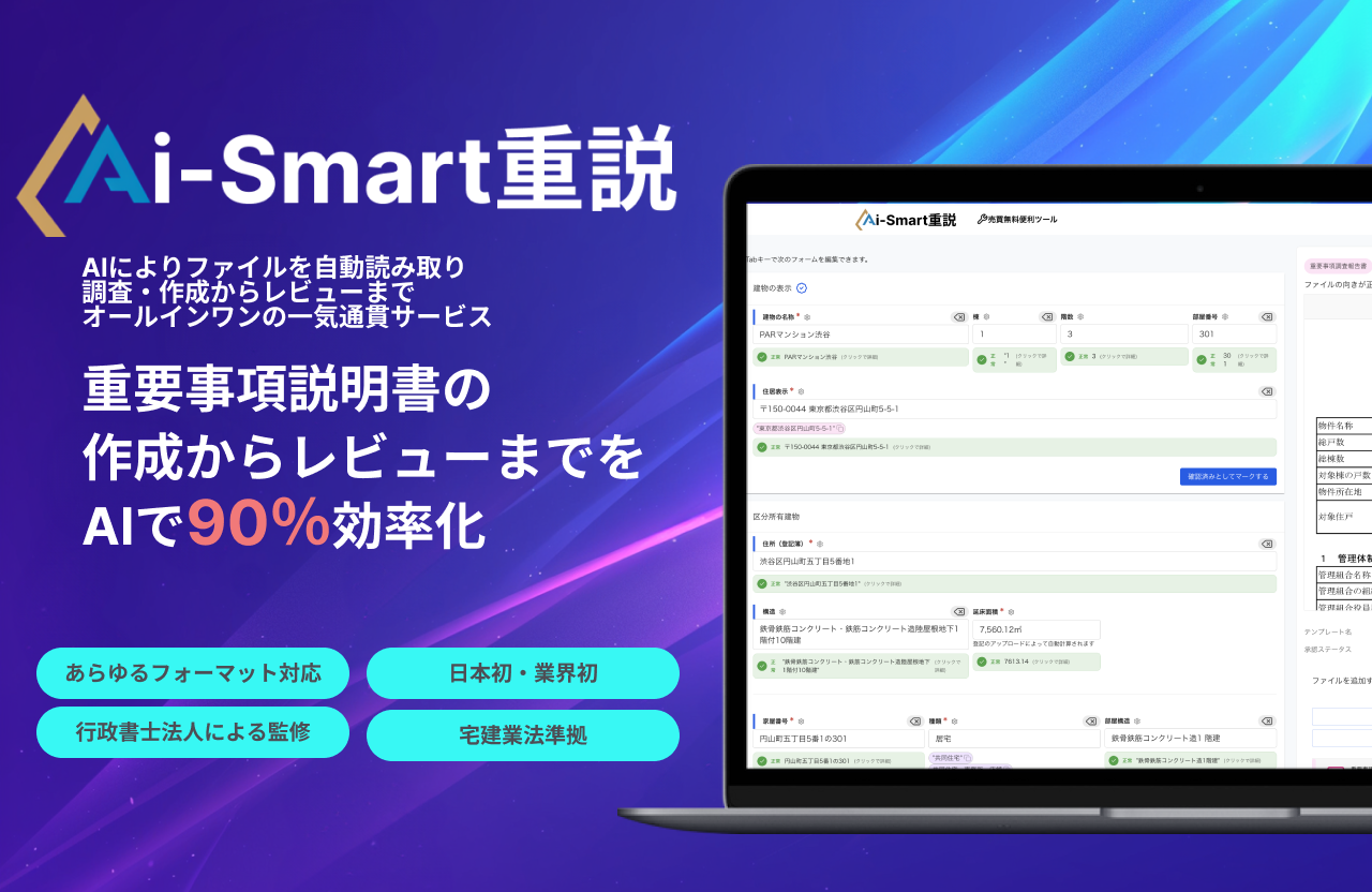 2025年10月より、これまで多くのご要望をいただいていた「Aiスマート重説 売買版」の提供を開始いたします。売買特有の複雑な権利関係や管理規約などもAIが的確に読み取り、高品質な重説作成をサポートします。