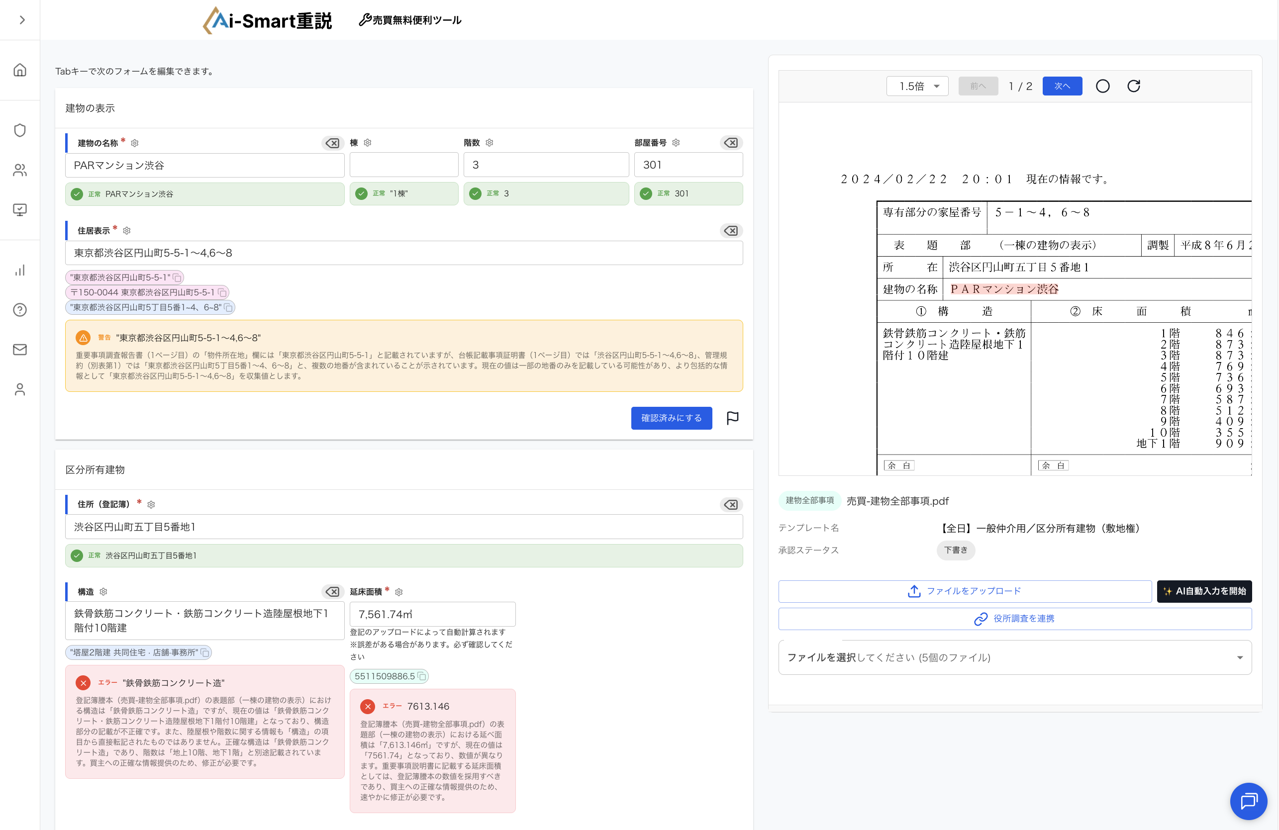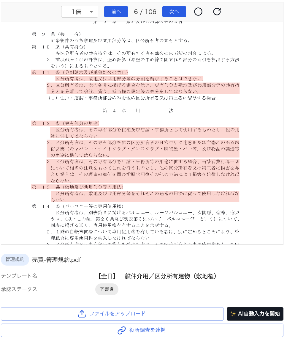 登記簿謄本、重要事項調査報告書、管理規約などの資料をアップロードするだけでAIが自動解析