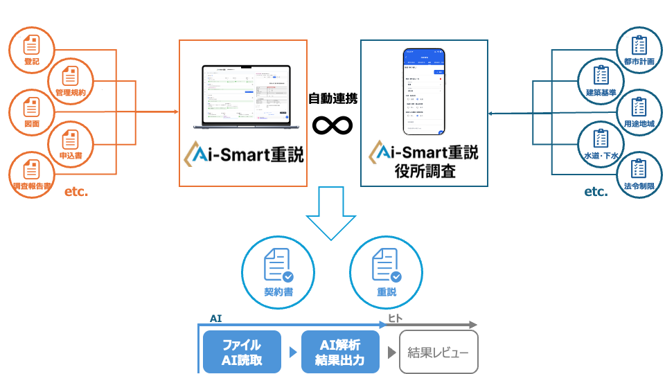 「Aiスマート重説」では、登記簿・図面・管理規約・重要事項調査報告書などの各種ファイルをAIが自動で読み取り、重説および契約書の作成から内容レビューまでを一貫して実施。専門性の高い業務を効率化し、人的ミスを削減するとともに、業務の標準化と90%以上の効率化を実現します。
