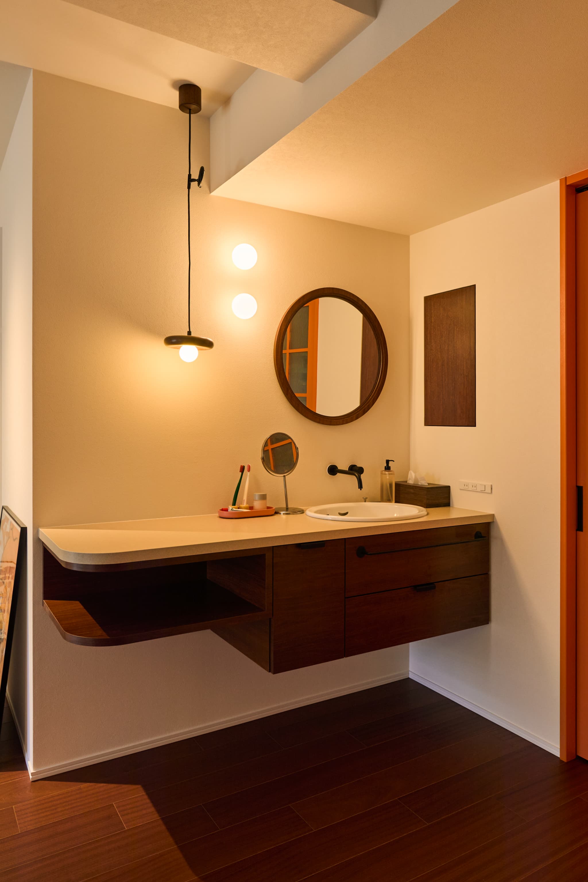 赤みのある木目やアクセントカラーのオレンジを取り入れ、洗練された印象と温かみを両立。家具や照明との調和により、可愛らしさと落ち着きを兼ね備えた住まいに仕上げました。
