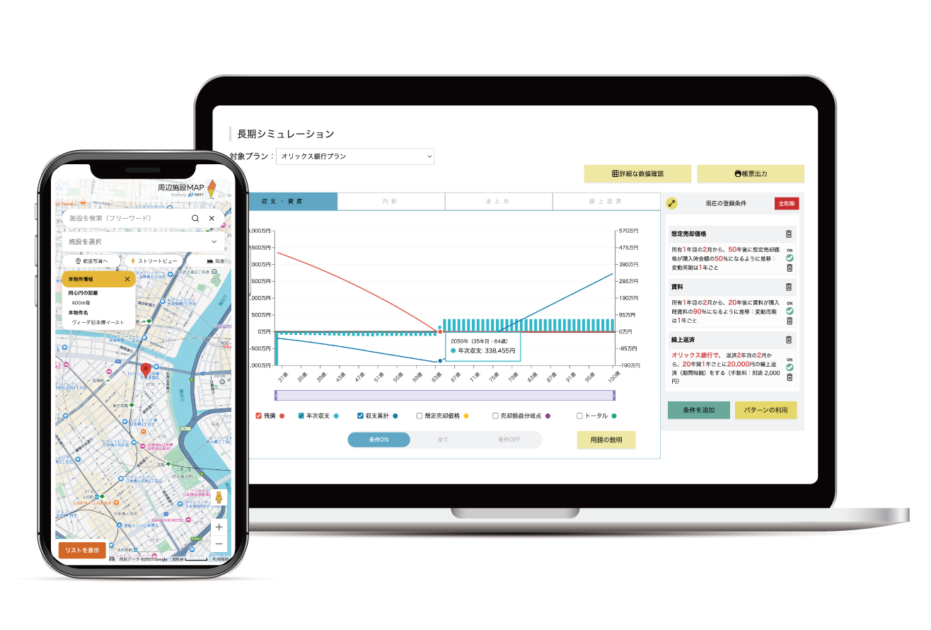 本サービスでは対象の物件を購入した際に必要となる詳細な支払額はもちろんのこと、完済までに繰り上げ返済を行った場合や複数ローン・ボーナスローンを組んだ場合など様々なシチュエーションを想定したシミュレーション資料を簡単な操作で瞬時に作成可能です。