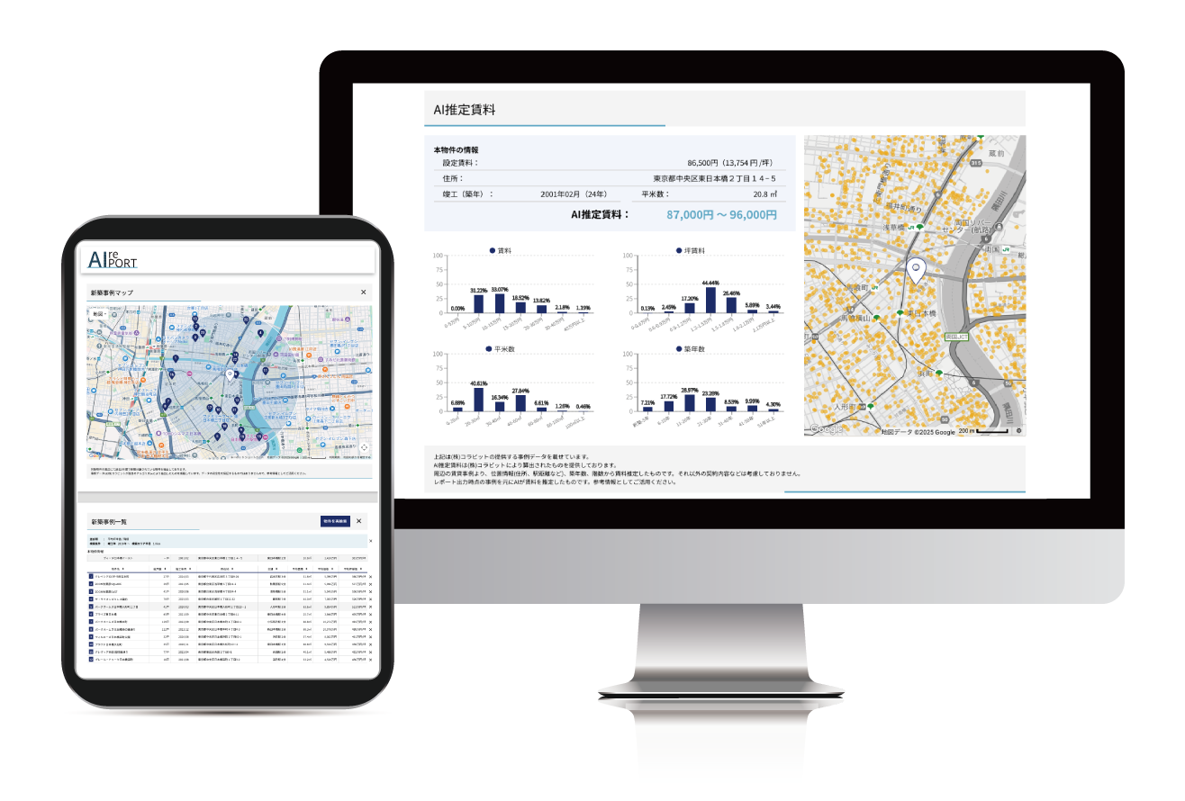 対象物件と類似性の高い取引事例などを瞬時に出力する「AIレポート」機能