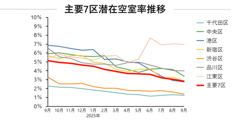 六本木・赤坂エリアの潜在空室率は2024年度に複数の大型物件が竣工した影響により、一時10.67%まで上昇したが、その後順調に回復し、今月は2.96%と2020年3月ぶりに3%を切った。