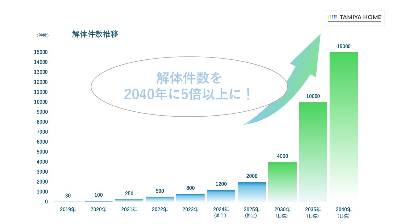 • 中期目標(2035年):年間解体件数10,000件達成を予定し、事業を通じて社会インフラの再生を大規模に推進します。