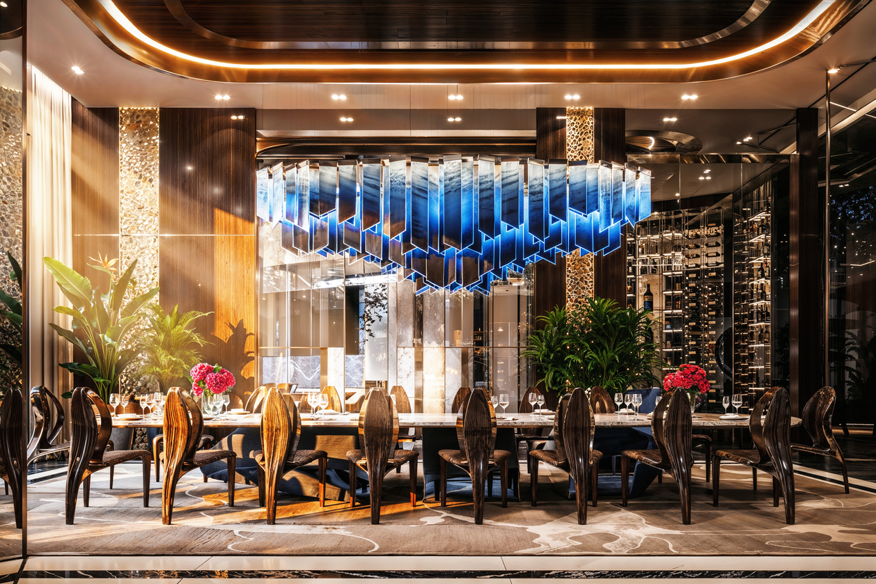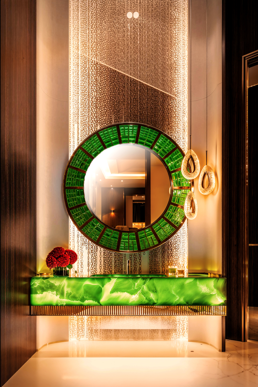 • オニキス:ソザビーズで競売予定だった希少石を邸内バーのカウンターとして採用。表面は世界最高品質のメタリックペイントで仕上げられています。