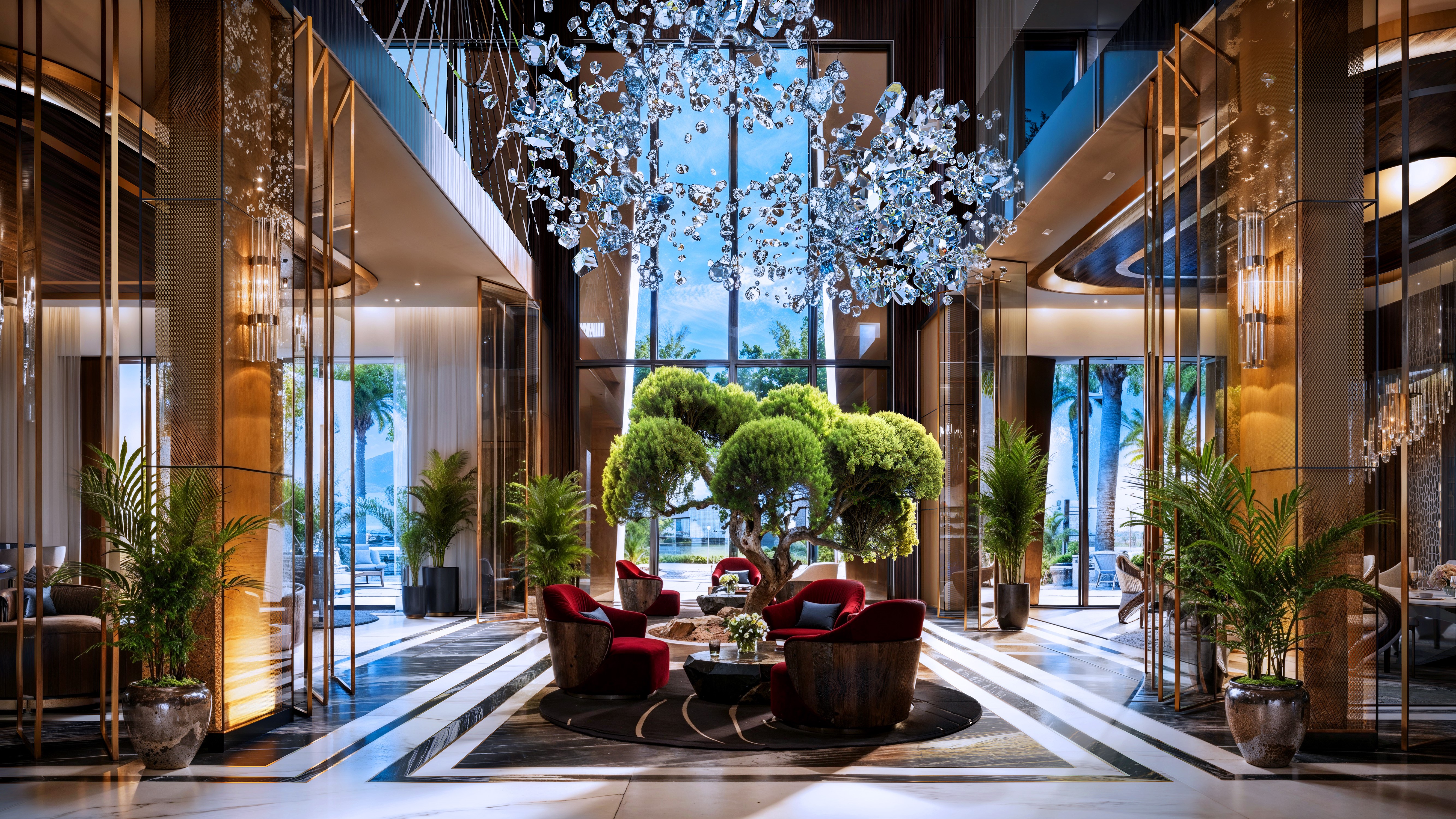 • 建築技術:軽量化された天然石を用いた発光ストーン技術を採用。