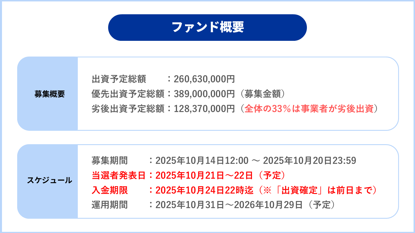 本ファンドでは、「劣後出資比率33%」「全期間配当保証(早期償還時はアップサイド配当)」「5日ルール+翌日償還」を採用するとともに、「投資家プロテクトルール」および「償還用リザーブ資金制度」を導入し、投資家保護を重視した堅実な運用体制を構築しております。