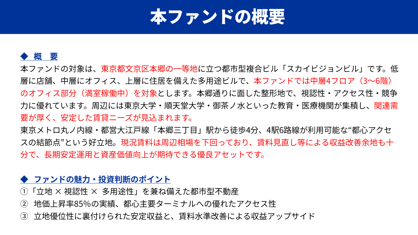 本ファンドは、東京都文京区本郷に位置する「スカイビジョンビル」中層4フロアを対象としたオフィス運用プロジェクトです。文教・医療・ビジネスが融合する本郷エリアにおいて、安定的な収益性が見込まれる資産を選定いたしました。