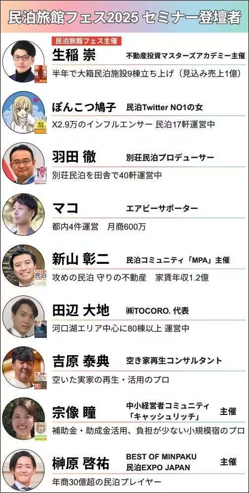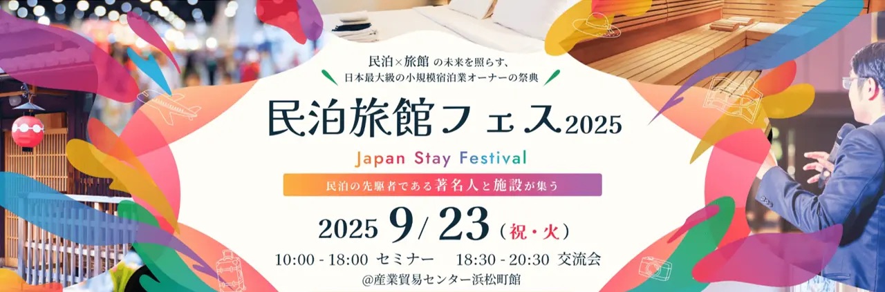 ※「民泊旅館フェス2025」の最新情報は上記公式LINEアカウントにてお知らせいたします。また、「民泊旅館フェス2025」の参加申込はLINE登録者の方から優先的にご案内いたします。フェスに関連した限定サービス・特典情報も今後LINEで先行公開予定となっています。