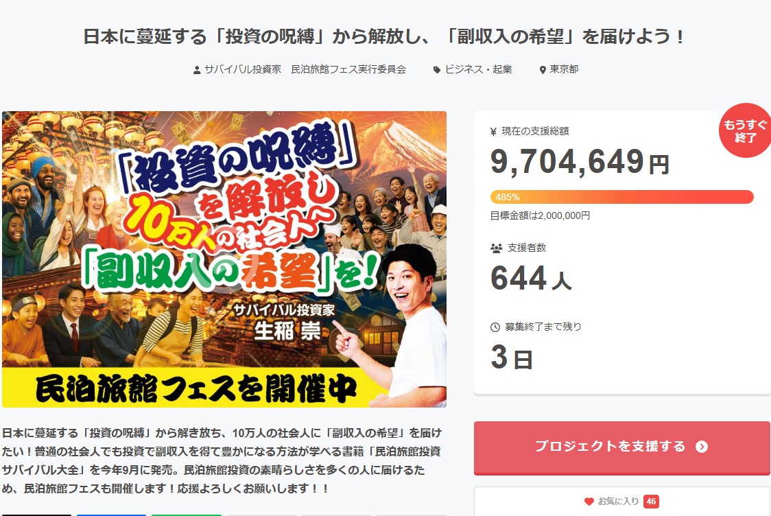 民泊旅館フェス実行委員会を運営する、CFコンサルティング株式会社(所在地:東京都北区、代表者:生稲 崇(サバイバル投資家))は、日本で広がる「投資=ギャンブル」という固定観念(=”投資の呪縛”)を解き、誰もが投資で毎月の副収入を得られる希望溢れた社会を目指すプロジェクトを開催中です。