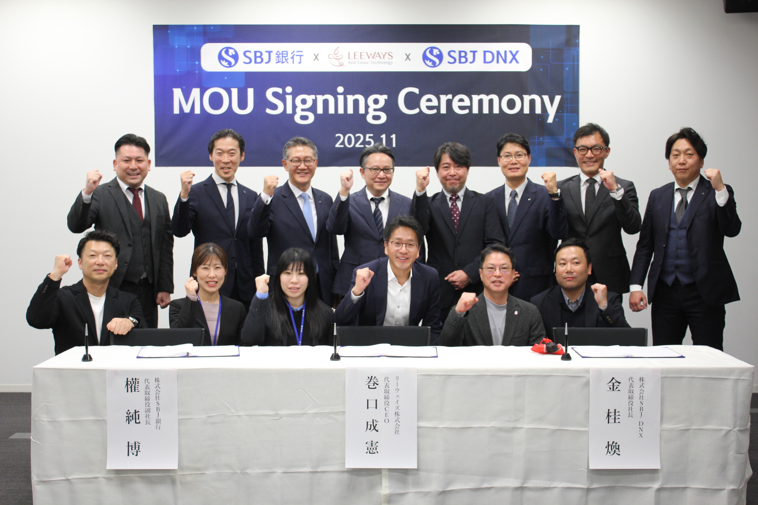 リーウェイズ株式会社(本社:東京都渋谷区、代表取締役CEO:巻口 成憲、以下「当社」)は、株式会社SBJ銀行(本店:東京都港区、代表取締役社長:並木 稔、当社グループを総称して「SBJ銀行グループ」)、株式会社SBJ DNX(本店:東京都港区、代表取締役社長:金 桂煥、以下「SBJ DNX」)と、下記の通り、業務提携に関する覚書を締結しましたので、お知らせいたします。