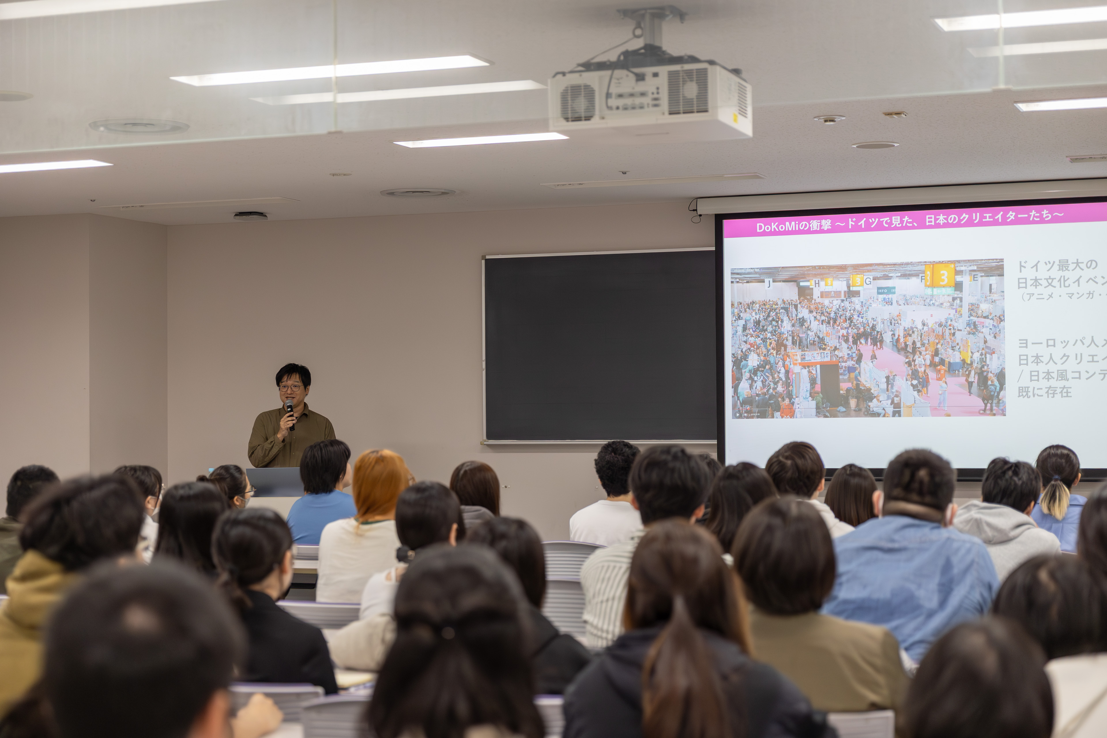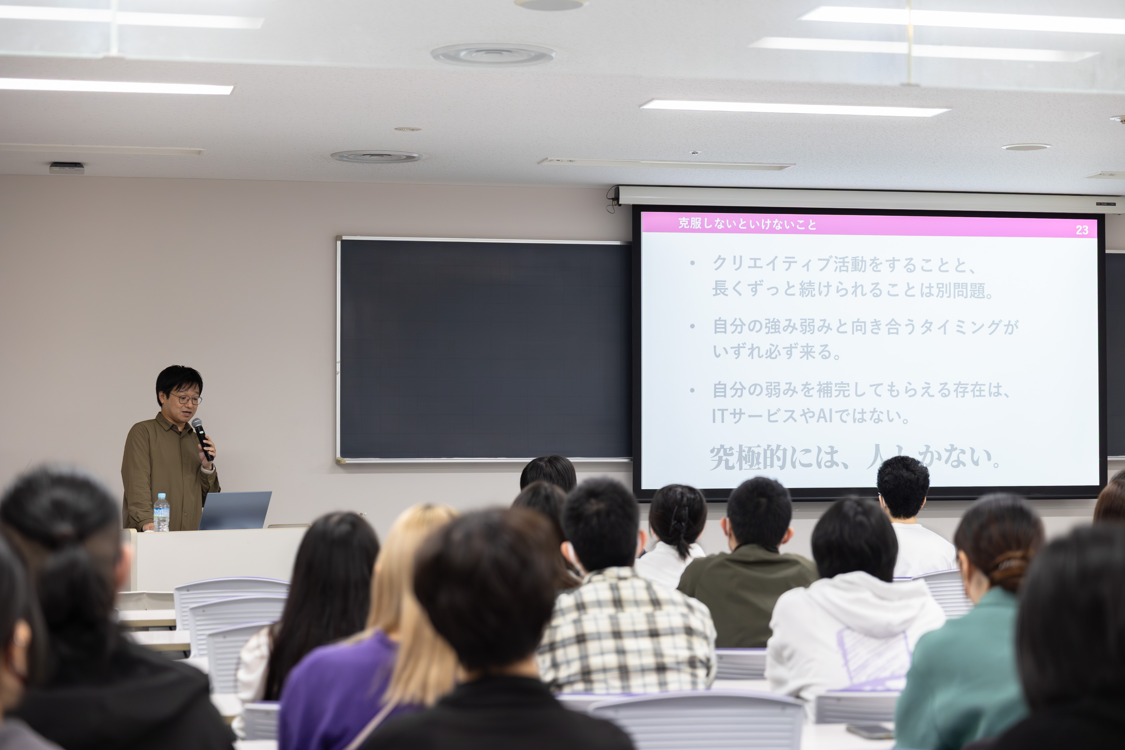 「創作を生活と切り離さず、環境そのものが作品の質を押し上げる」という考え方に、多くの学生がメモを取りながら聞き入っていました。