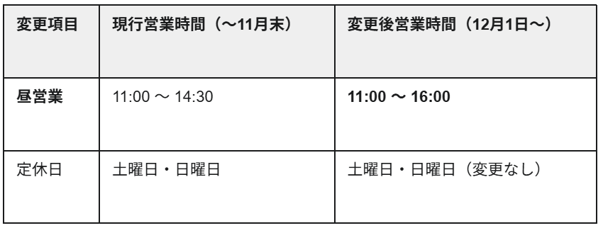 地域の皆様の多様なライフスタイルに対応し、より多くの方にご利用いただくため、昼営業の営業時間を以下のように拡大いたします。昼食の提供に加え、地域住民の皆様がゆったりと過ごし、交流する場を積極的に提供してまいります。